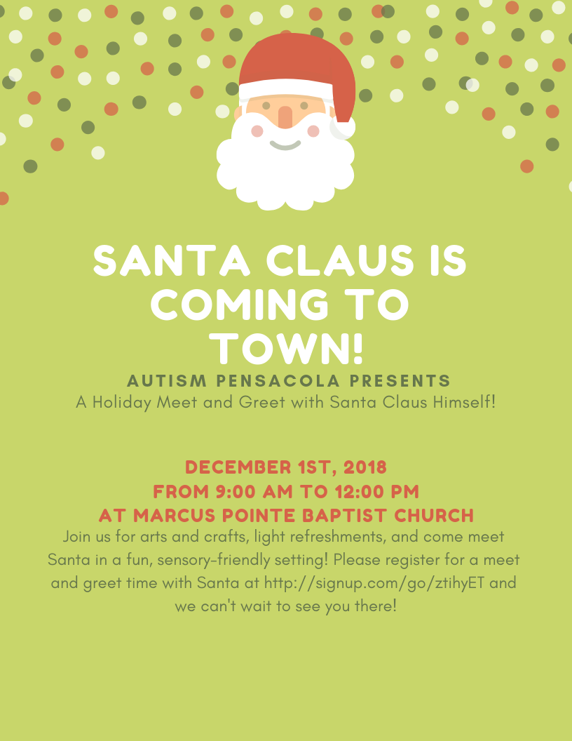 Santa Claus is coming to town! And he’s stopping by Autism Pensacola’s party for pictures. Join us on Dec. 1 from 9 a.m. to noon at Marcus Pointe Baptist Church for pictures with the Jolly Ol’ Elf. Sign up for your picture time here: http://signup.com/go/ztihyET. While you wait, we will have arts & crafts, light refreshments, a quiet zone, and a movie room.